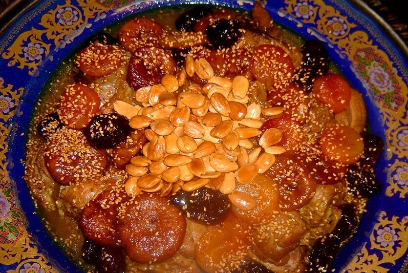 Еще одно необычное сочетание сладкого с соленым, которое так любят в Марокко. Мрузию чаще всего готовят из баранины со сливами и изюмом, но есть и другие варианты (с курицей или говядиной, например). Мясо тушат в бульоне с пряностями, имбирем и сухофруктами, а затем добавляют миндаль, кунжут и мед. Звучит странно, но получается действительно вкусно. Мясо, приготовленное таким способом, тает во рту – настолько оно нежное. Сладость сухофруктов и пряности идеально раскрывают его вкус. Рагу подают с чем-то нейтральным: с рисом, нутом, иногда с кускусом. Обязательно попробуйте это блюдо в одном из ресторанов Марокко, оно действительно вкусное – так больше нигде не готовят.