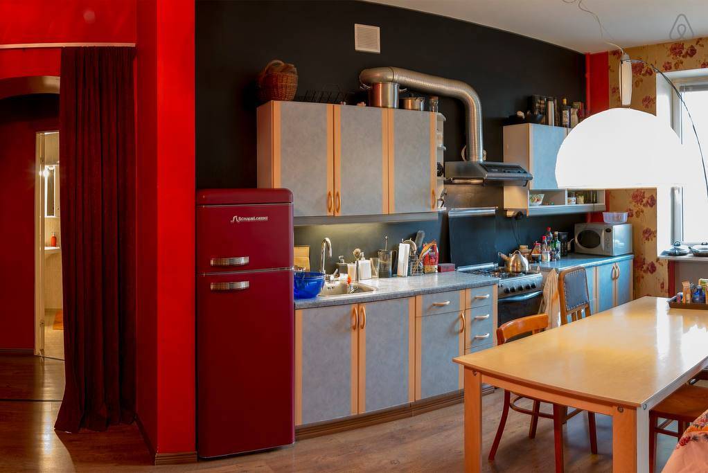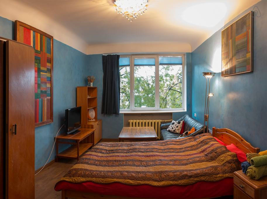 Гостям предлагают две комнаты с двуспальными кроватями, диванами и платяными шкафами. Туристам нравятся жизнерадостные голубые стены и яркие картины. Большая кухня полностью обставлена. Пользуйтесь плитой, холодильником, микроволновкой и посудой. Есть стиральная машина и два больших стола. Минус — жилье немного темное.