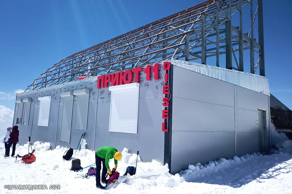 Скольким туристам сегодня обеспечивает кров и тепло «Приют 11»? Проживание здесь гарантировано 70 путешественникам. В том числе оно организовано в вагончиках-бытовках. Одновременно с этим запущено возведение нового здания. С этой целью разработан футуристический проект, перекликающийся со сгоревшим отелем, и уже установлен мощный фундамент рядом с временной базой.