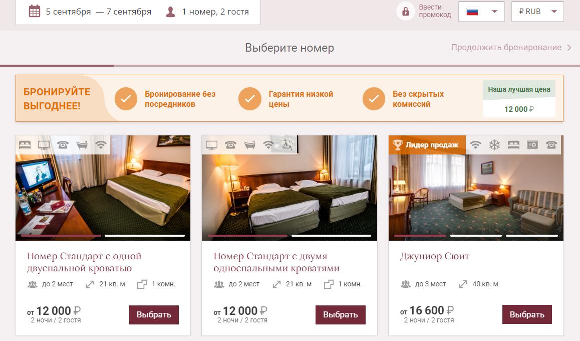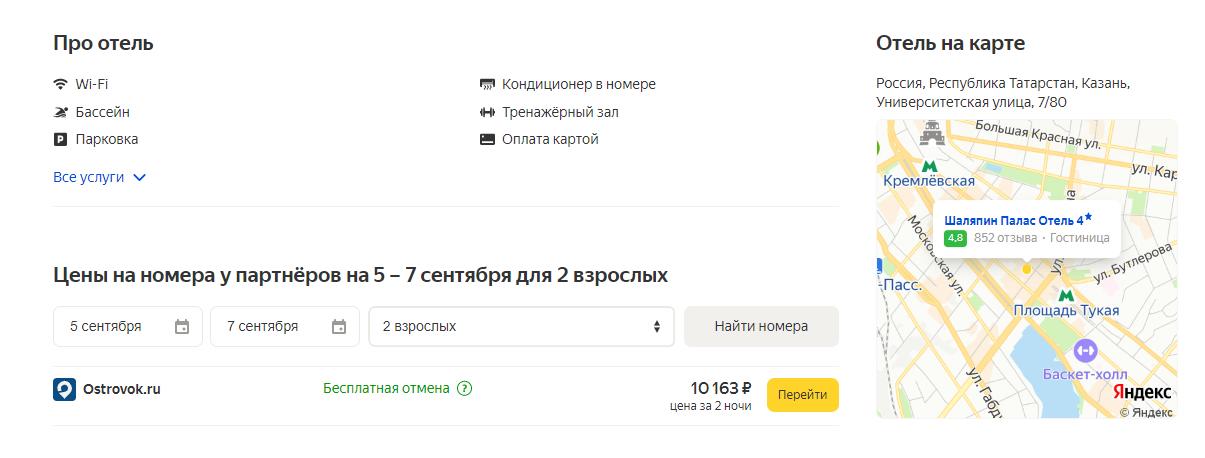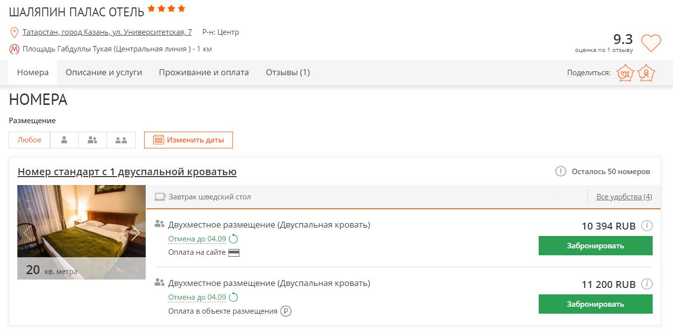 Представим, что мы хотим забронировать отель «Шаляпин Палас» в Казани на 5-7 сентября 2022 года на двоих. Переберем варианты: