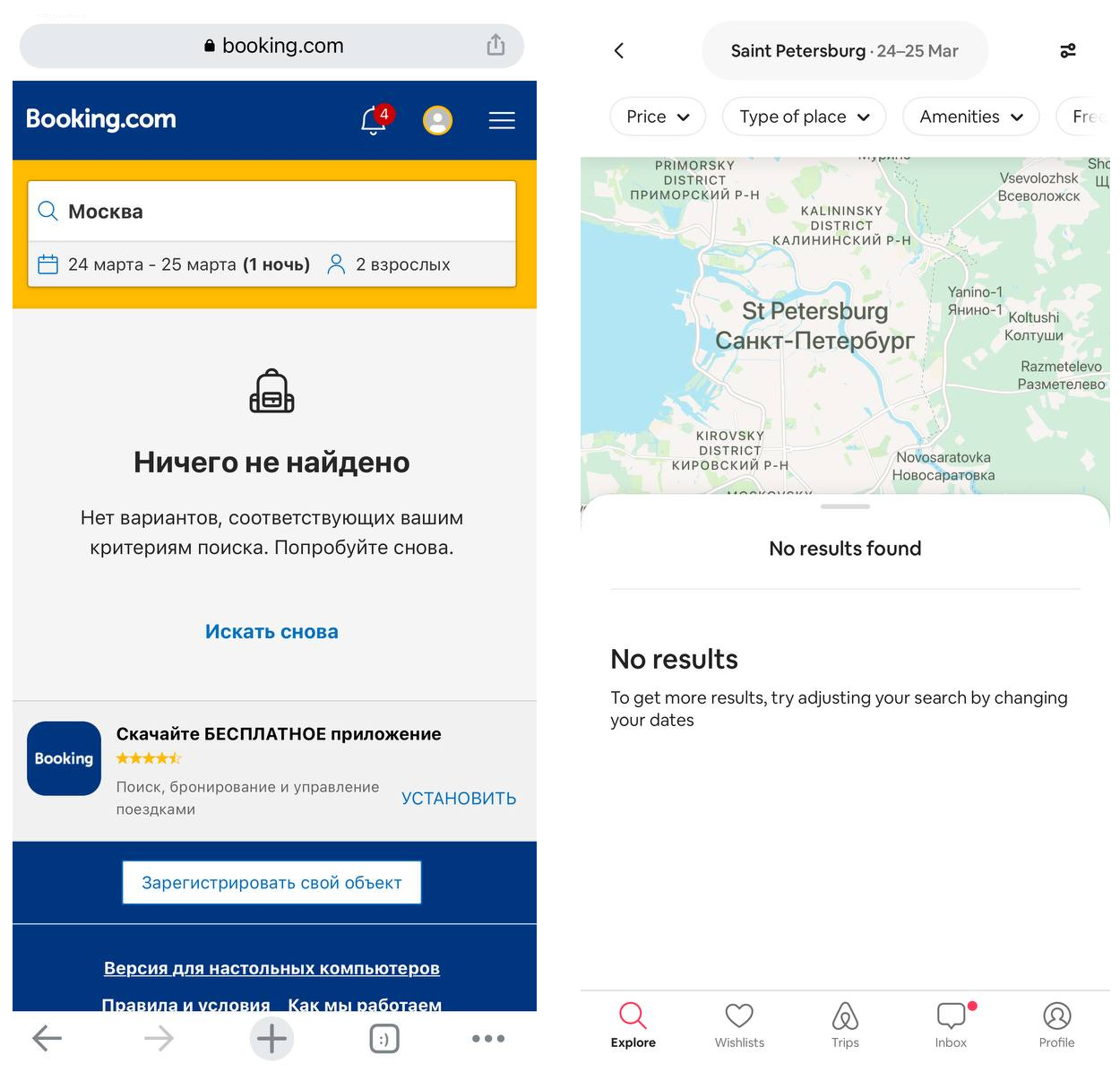 4 марта 2022 года «Букинг» и «Эйрбиэнби» приостановили работу с российскими и беларускими объектами размещения. 4 апреля «Эйрбиэнби» объявила о том, что гости из России и Беларуси «больше не смогут оформить бронирование где бы то ни было». А все оплаченные бронирования после 4 апреля отменены.
