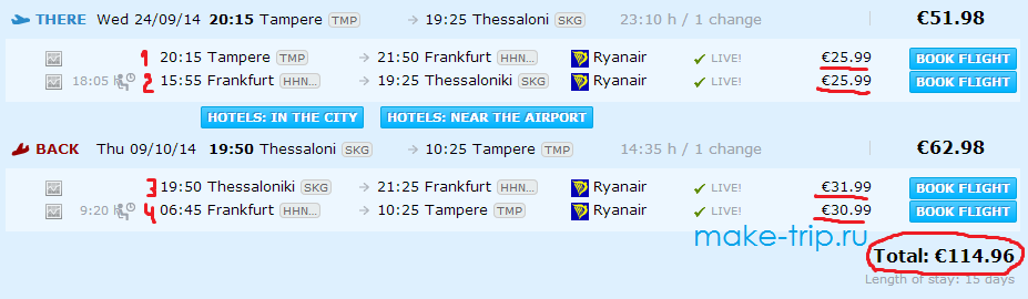 Начнем наш обзор с самого бюджетно авиаперелета в Грецию из Финляндии. Таковым является полет на борту одной их самых популярных лоукост-авиакомпаний Европы (подробнее о них читайте здесь) Ryanair из Лаппеенранты в Салоники с пересадкой в каком-нибудь европейском городе. Маршрут несколько сложный (придется выдержать 4 перелета), однако самый дешевый – все билеты можно купить всего за 100 евро!