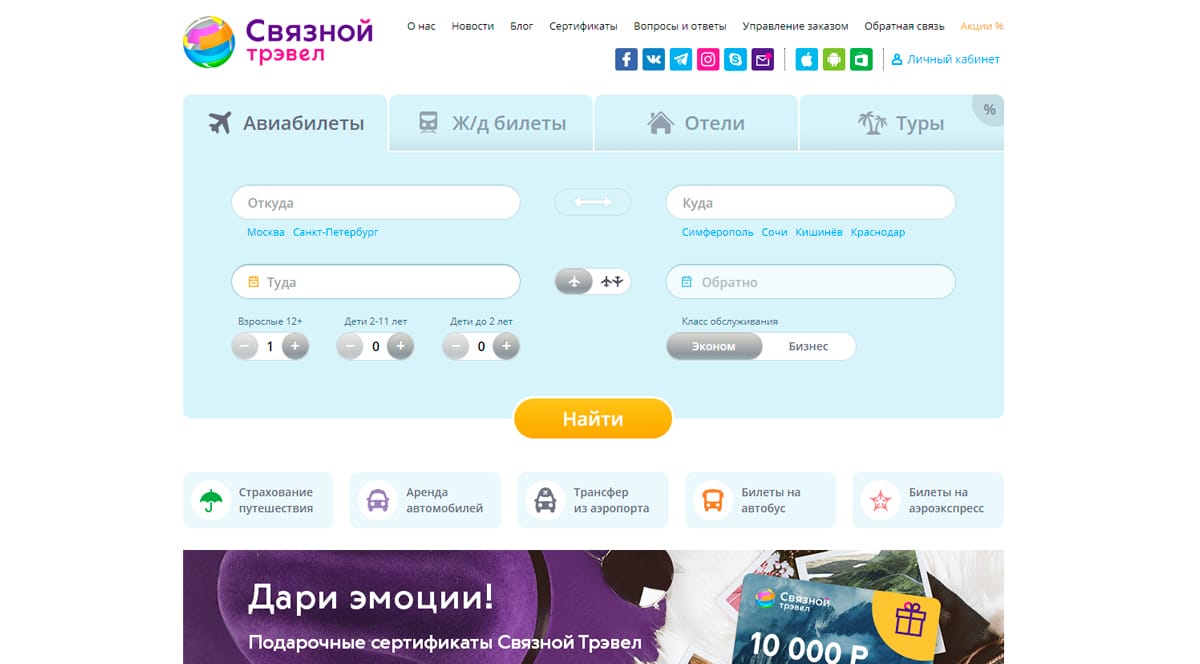 Купить ж/д или авиабилет, взять напрокат автомобиль, заказать трансфер, забронировать отель – это все возможно на сайте Связной Трэвел. С февраля 2012 года компания помогает путешественникам в планировании отдыха и деловых поездок. Простой поиск не займет много времени на заполнение формы и покажет оптимальные варианты по выбранным рейса.