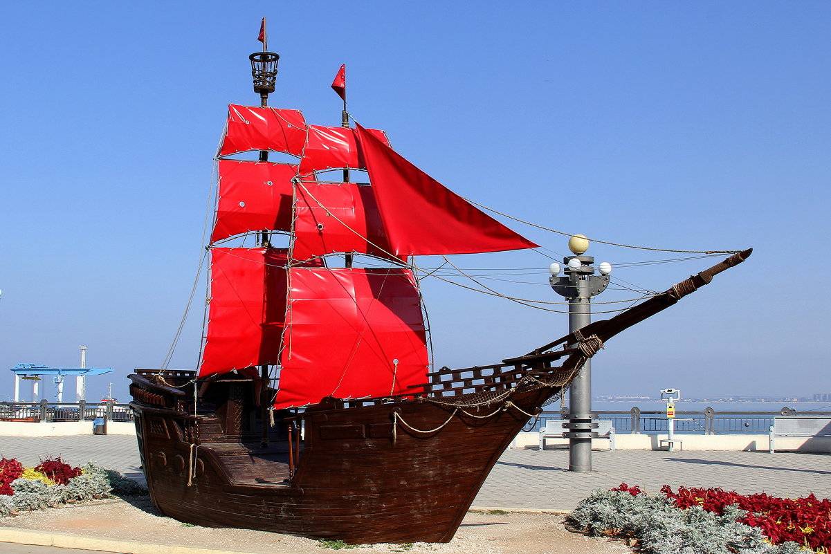 Красивый 5-метровый корабль с алыми парусами установлен в самом начале анапской набережной.