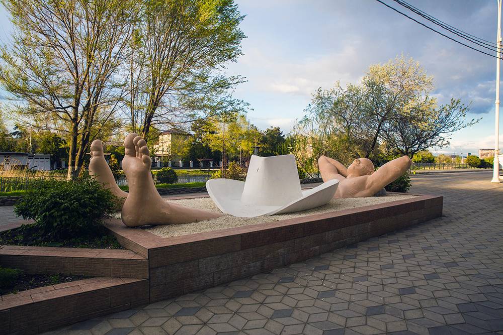 Еще одна интересная достопримечательность Анапы установлена на городском променаде прямо у входа на пляж. Ее сложно не заметить: это типичный курортник, который разлегся на теплом песке, прикрылся ковбойской шляпой и позабыл о проблемах. Что любопытно, каждый сезон эта скульптура немного преображается – вместо песка вокруг отдыхающего насыпают гальку, высаживают цветы или же сеют газон.