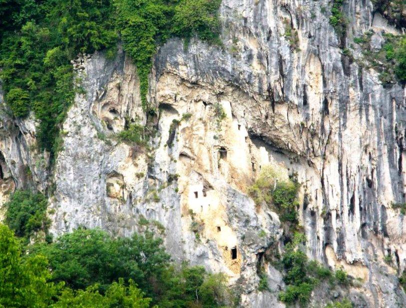 Рядом с форелевым рыбзаводом протекает река Мчишта, и если идти по тропинке через заросли самшита, то можно выйти к гигантскому утесу, в недрах которого находится знаменитый абхазский скальный монастырь. История его такова, что в средние века скальный замок был построен людьми для спасения от набегов пиратов. А уже в мирное время в каменных кельях поселились монахи отшельники. Вся загвоздка в том, что попасть внутрь скалы без специального альпинистского снаряжения невозможно! Кельи находятся на расстоянии 50 метров от земли и поэтому посмотреть их можно только стоя у подножия скалы.