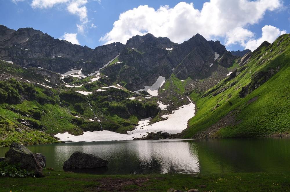 Мзы (Мзым) – горная природная достопримечательность, привлекающая не только своей красотой, но и маршрутом к ней. Высота Мзы над уровнем моря – 2 километра. Озеро невелико, в глубину достигает 40 метров, наполнено водой из растаявших ледников. Купаться в Мзыме не стоит – вода редко прогревается теплее 4 градусов, а вокруг даже в июле лежит снег. Озеро находится в Рицинском парке, считается одним из самых легкодоступных – сюда можно пройти по тропе или проехать по дороге. Маршрут непопулярен, поэтому туристов у Мзы почти нет. Чтобы не заплутаться и узнать много интересного о местных краях, пользуются услугами гида. Можно взять напрокат лошадей, чтобы добраться до берегов, по пути получив еще более яркий опыт.