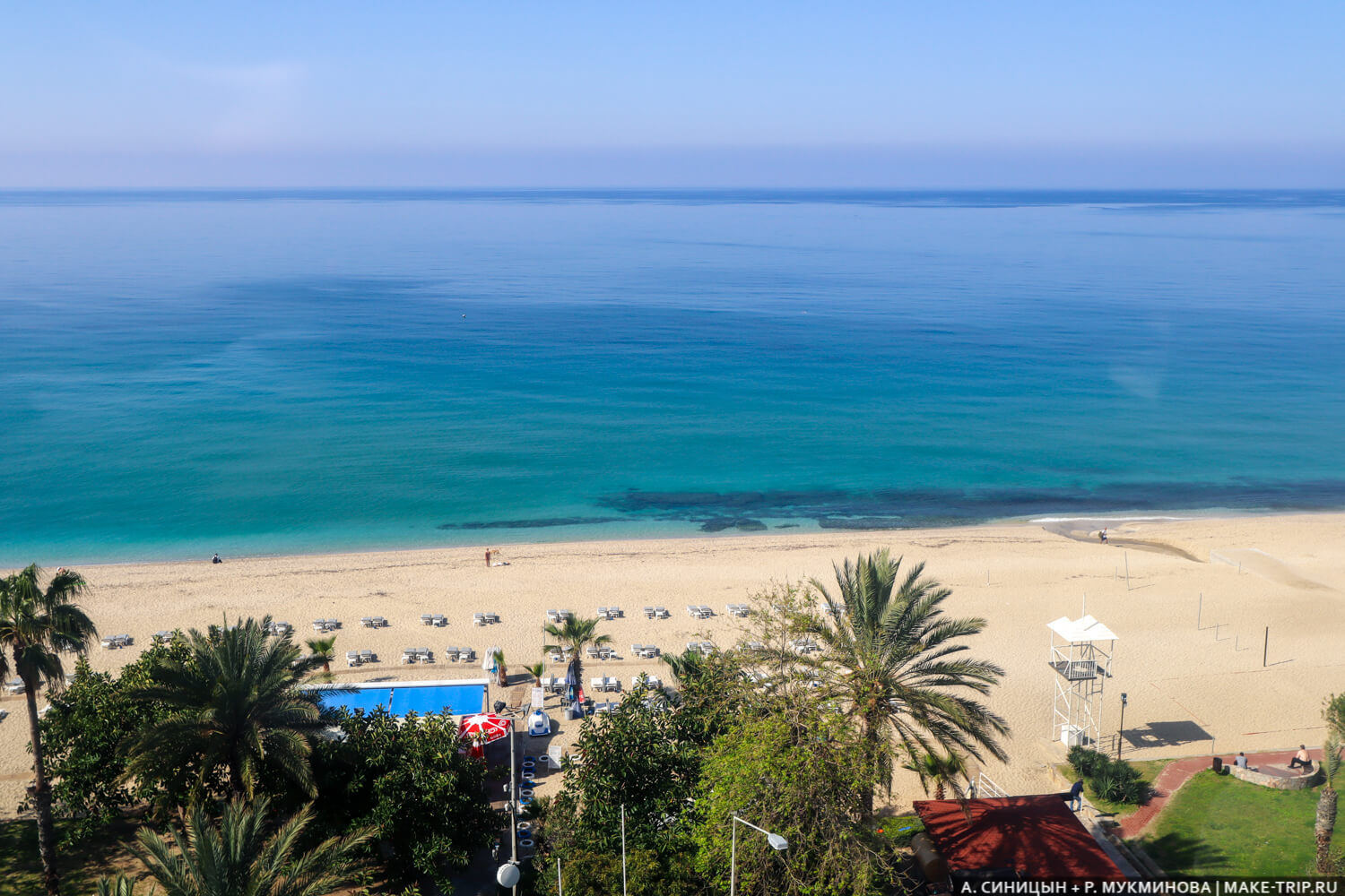 Честно говоря, на наш привередливый взгляд, пляж Клеопатра сильно переоценен. И шумиха вокруг него тоже перегрета. Пляж действительно неплохой, песок намного приятнее, чем на пляже Кейкубат, но все равно в воде плиты, а на море волны. Здесь красиво, живописно, но это все же не идеальный пляж, не верьте рекламе. Мелкий ракушечный песок сюда привезли из Египта, а один отельный гид нам сказал, что с Мальдив. Но это, конечно, не правда. Скорее сказка для туристов. Согласно легенде, этот пляж подарил римский полководец Марк Антоний царице Клеопатре.