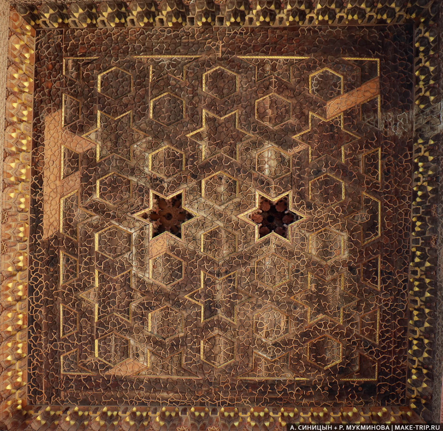 Оригинальный михраб частично восстановили. Деталь потолка деревянного айвана.