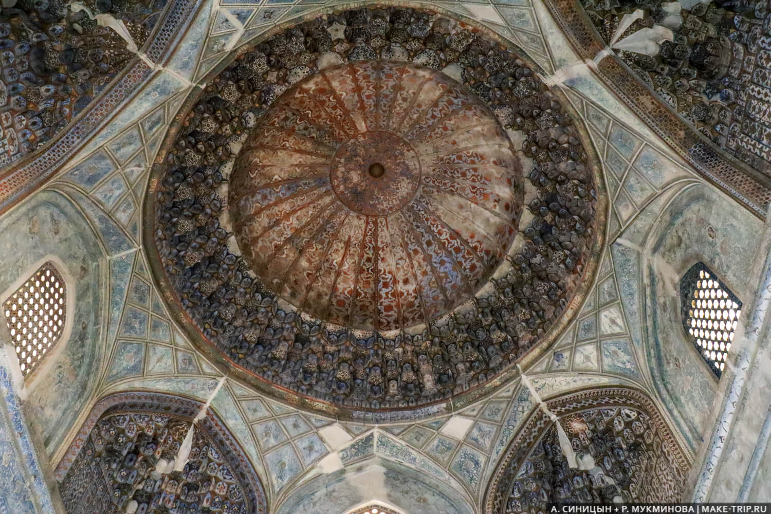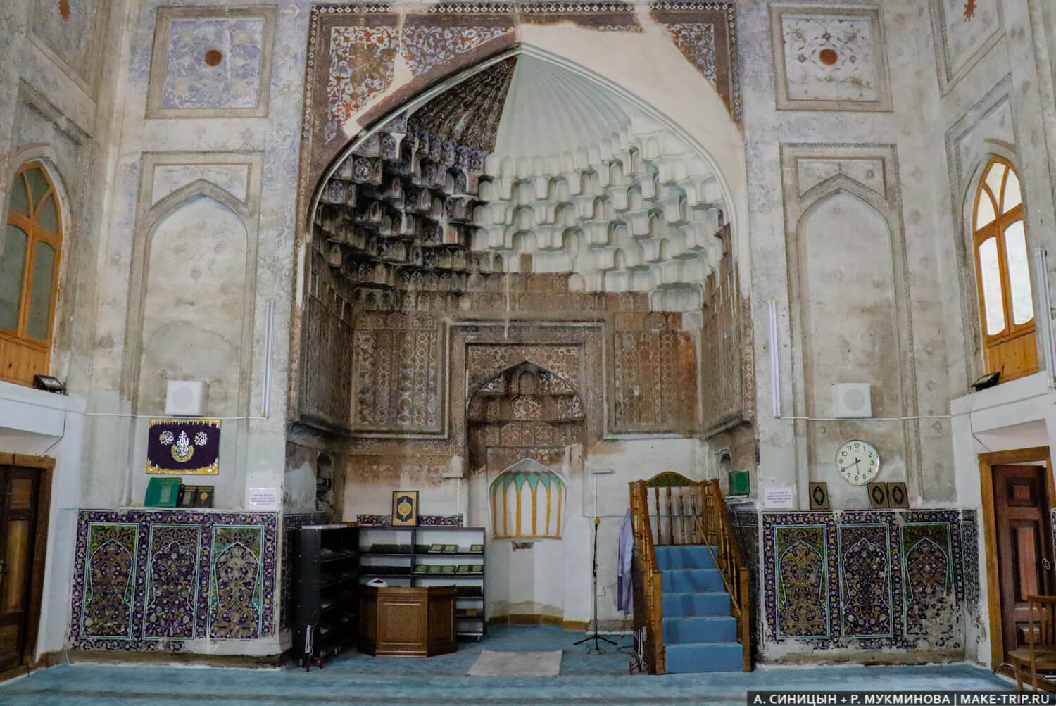 Эту мечеть в Бухаре посмотрите обязательно! Её убранство восхитительно: богато расписан потолок, оригинальный михраб частично сохранился, а по низу идет красочные панели. В этом зале мечети суфии устраивали религиозные церемонии. Летний айван оригинальный. Во дворе мечети был хауз, но сейчас в нем нет воды.