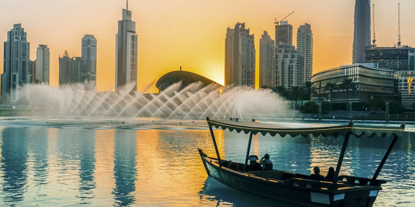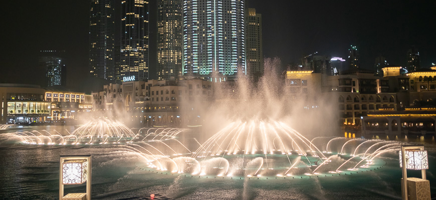Одна из главных достопримечательностей Дубая находится в озере Burj Khalifa Lake, огромном искусственном водоеме, созданном рядом с башней Бурдж Халифа. Комплекс танцующих и поющих фонтанов занимает территорию длиной 275 м, шириной 100 м. По форме они представляют собой две дуги и пять окружностей. Высота водных струй может достигать пика в 152 м. Водное шоу проходит 11 или 13 раз в сутки. Хотя технически дневные и вечерние представления особенно не отличаются, но выглядят они по-разному. Водные струи, раскрашенные солнцем, очень красивы, но особенно впечатляет ночная феерия с искусственной подсветкой. Танец фонтанов сопровождается музыкой. В водном репертуаре есть и арабские мелодии, и мировые хиты.