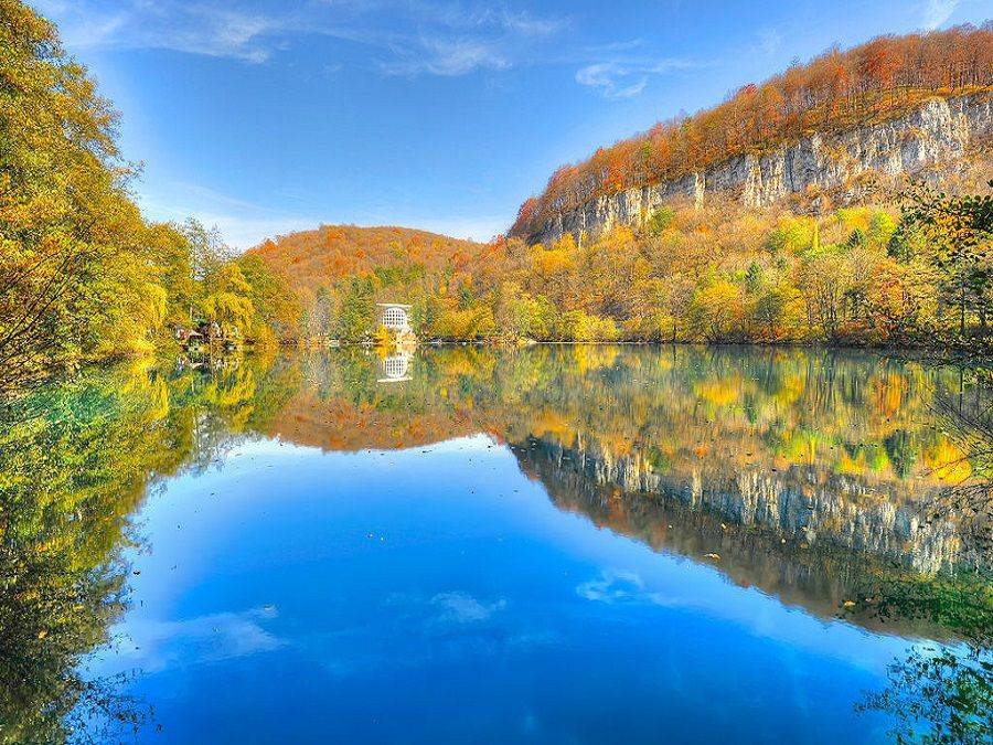Голубой водоем – загадочное место, хранящее много тайн. Один из основных вопросов – откуда пополняется озеро, расположенное в 800 метрах над уровнем моря. В него не впадают ни ручьи, ни реки, но при этом вытекает река с суточным объемом более 70 000 кубометров воды. Ученые предполагают, что в этом месте находятся подземные источники.