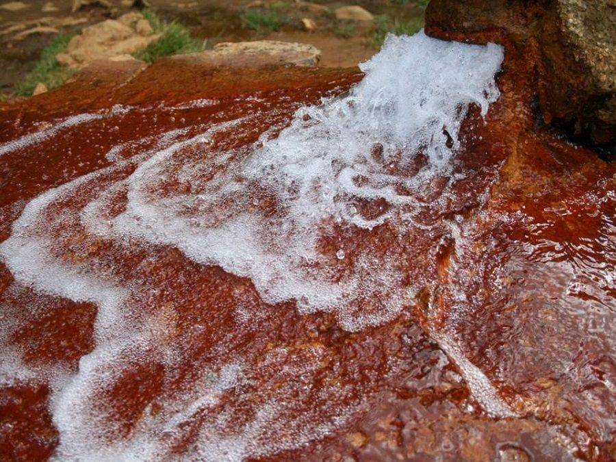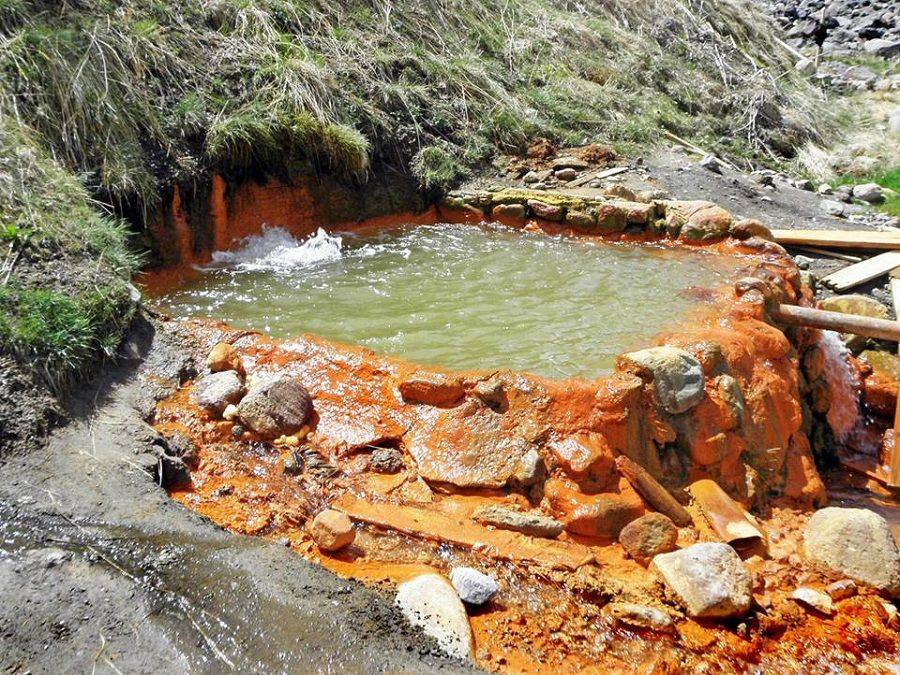 На поляне в окружении сосновой рощи из-под земли бьют несколько минеральных источников нарзана, окрашивая все вокруг в ярко оранжевый цвет – вода здесь богата кальцием, железом, натрием, магнием и калием.