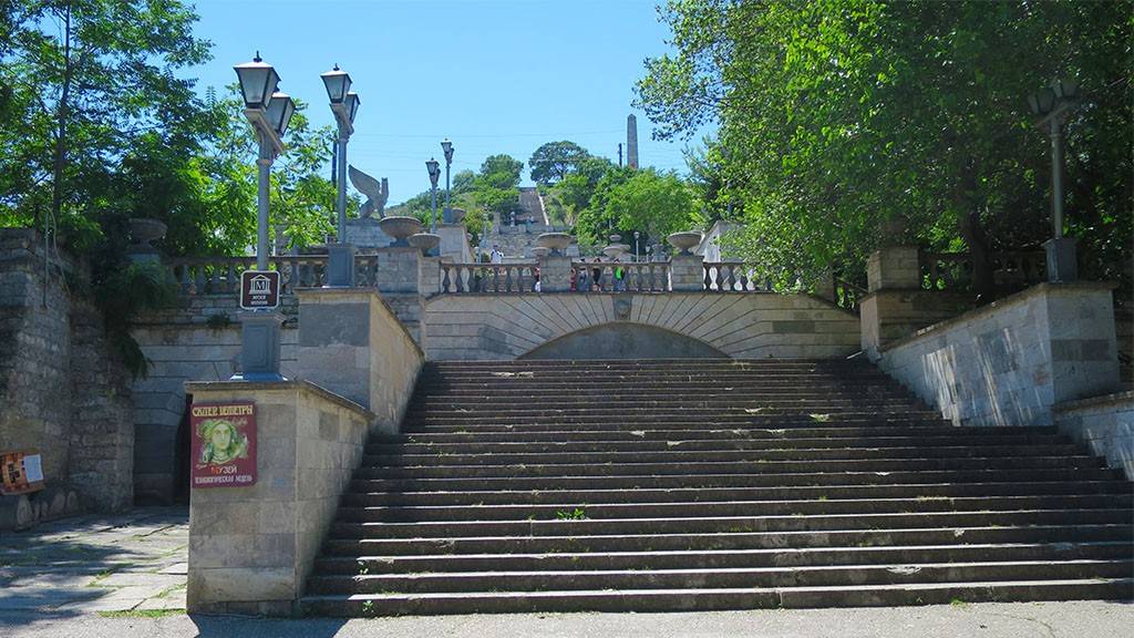 Архитектор из Италии Дигби спроектировал сооружение в 19 веке. Подъем пологий и несложный. Лестничные пролеты украшены лепниной и каменными скульптурами. Со временем декор обветшал, но часть его сохранена до сих пор. Главные элементы здесь – каменные грифоны, являющиеся символикой города со времен Боспорских царей. На вершине лестницы расположена смотровая площадка, украшенная памятником Обелиск славы.