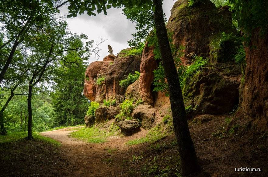 Красные камни — так называется следующая достопримечательность, образованная вследствие взаимодействия весьма непрочной породы песчаника с насыщенной железом водой. Со временем порода приобрела характерный ржавый оттенок, в следствии чего камни и получили свое название. Вершину композиции венчает гордый орел, символ всего Кавказа.