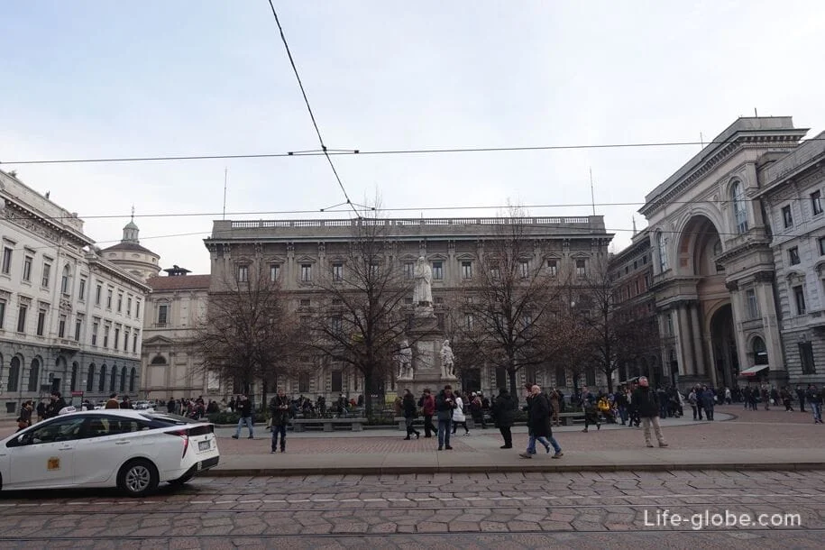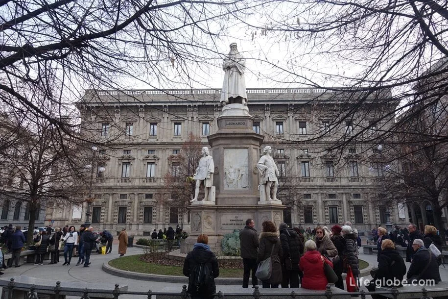 Фасадом театр Ла Скала выходит на одноименную площадь (Piazza della Scala), центр которой украшает памятник Леонардо да Винчи (Statua di Leonardo da Vinci).