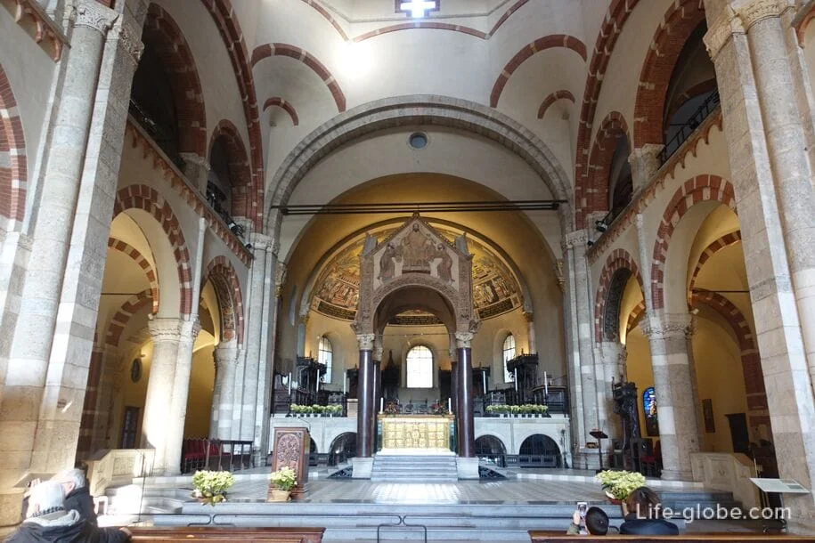 Под алтарем находится крипта, где в серебряном саркофаге находятся останки трех святых: Амвросия, Гервасия и Протасия. Подробнее о базилике Святого Амвросия в Милане…