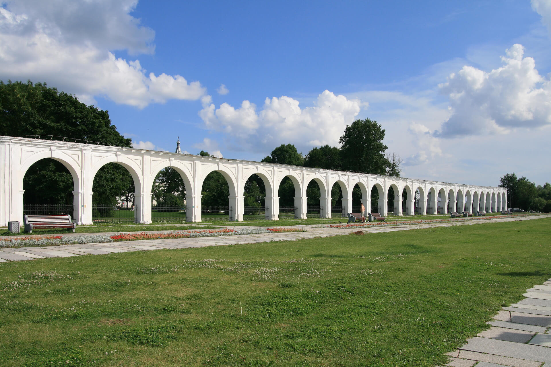 Аркада Гостиного двора – одна из древнейших достопримечательностей. Она представляет собой оставшуюся часть Гостиного двора второй половины XVII века. На этом историческом месте в XI веке находились Ярославово Дворище и Торг, с XII по XV столетия располагалась Торговая площадь, где проводилось и вече. После пожара 1606 года на этом месте началось строительство Гостиного двора, длившееся XVII—XVIII века.