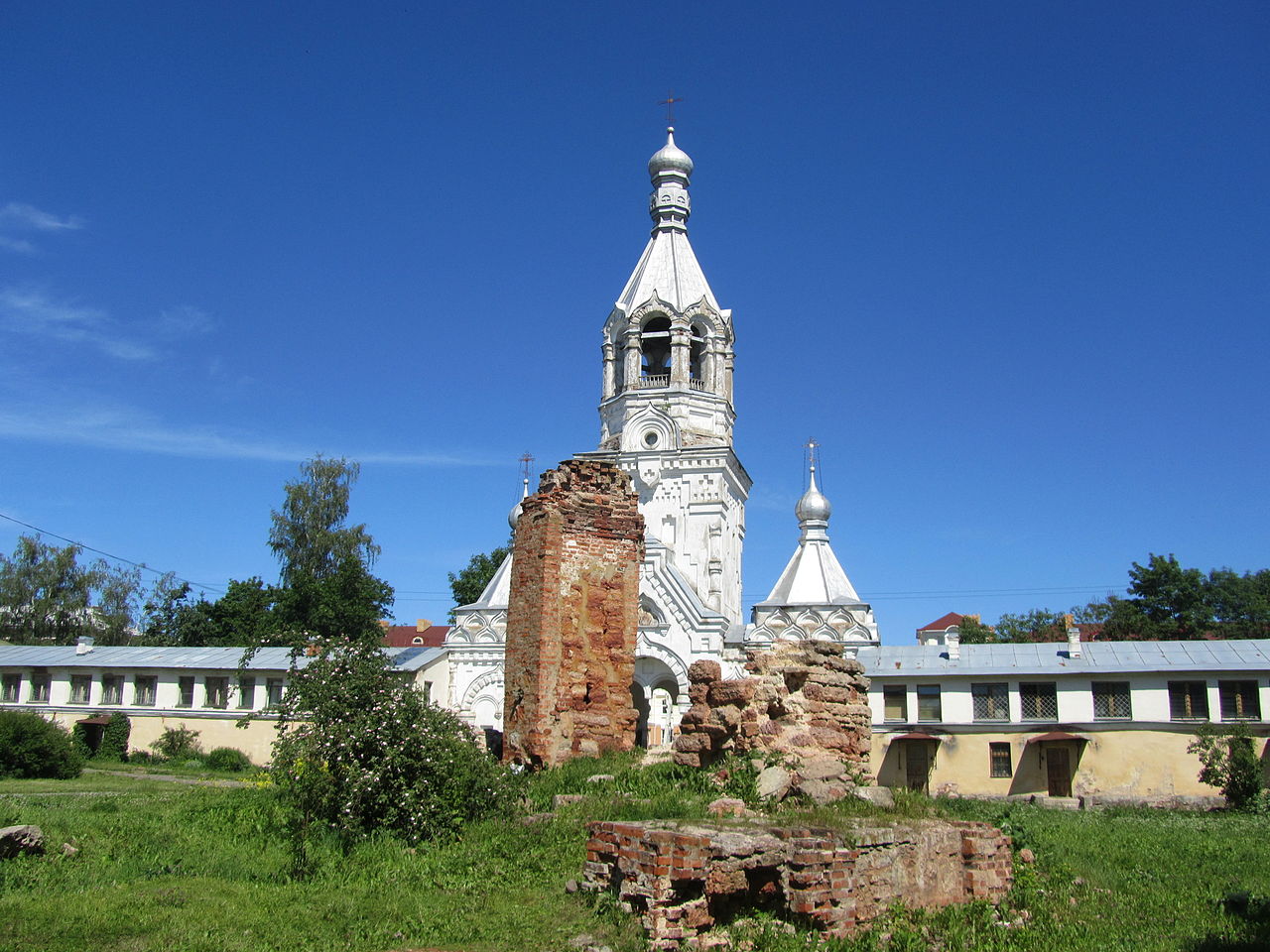 Считается, приказ заложить Десятинный монастырь в Великом Новгороде был отдан матерью Александра Невского, задумавшей отблагодарить Богородицу за защиту города, претерпевавшего осаду войском из Владимиро-Суздальской земли. Когда у новгородцев не оставалось сил и ресурсов держать оборону, они выставили на городской форт икону «Знамение», враг отступил. Церковь Рождества Пресвятой Богородицы разрушена во времена шведской интервенции, что в российской истории принято ассоциировать со Смутой. До настоящего дня не сохранились постройки, относящиеся к XIV веку, зато много образцов православной архитектуры позапрошлого столетия. К ним приписывают колокольню, корпуса для хозяйственных нужд и размещения послушниц. Башня с колоколами представляет собой явную эклектику в отношении стилевой принадлежности. Присутствуют черты громоздкого пафосного барокко, но они чрезвычайно гармонично уравновешены элементами в стиле ампир, что формирует визуально «невесомое» впечатление.