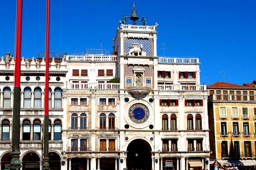В средние века на площади Сан-Марко проходили празднества и знаменитый венецианский карнавал, тут даже рисунок на мостовой не менялся с 13 века. Эту площадь чрезвычайно любят кинорежиссеры, поэтому она довольно узнаваема. Здесь находится знаменитый Дворец дожей (Палаццо Дукале), собор Сан-Марко, с севера и юга ее окружают здания Прокураций, в углу – колокольня, а часы на башне отбивают каждый час. На площади разрешается кормить голубей, здесь же работает старинное кафе “Флориан”. Его завсегдатаями были такие знаменитости, как Казанова, Байрон, Диккенс и Гете.