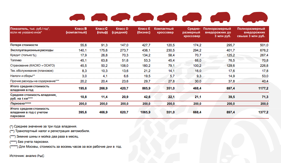 Согласно исследованию PwC, стоимость владения автомобилем в России в 2017 году составила от 195 тысяч рублей до 1 миллиона 170 тысяч (в зависимости от марки).