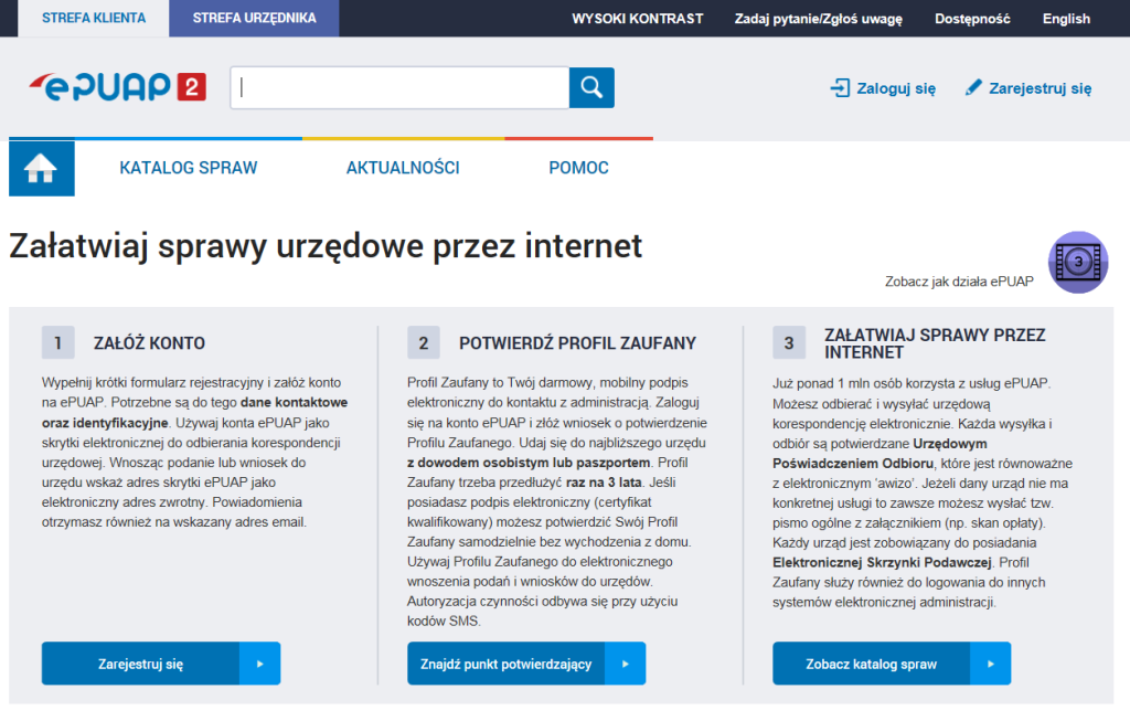 Можно сделать с мобильного телефона прямо в учреждении. Адрес сайта: epuap.gov.pl. Выбираем пункт «Zarejestruj się» в правом верхнем углу,