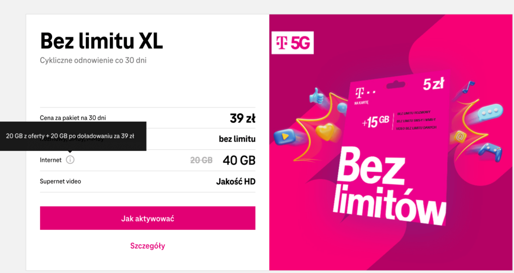 Итак, самый жирный тариф будет стоить 39 zł и вам дается 40 Гб трафика (по аналогии с Plus вы получаете 20 Гб в тарифе + 20 Гб за пополнение всей суммы одним платежом). И так работает со всеми тарифами.
