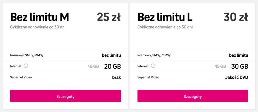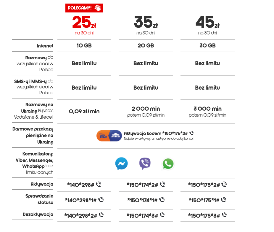 | Тариф 25 zł | Тариф 35 zł | Тариф 45 zł | |