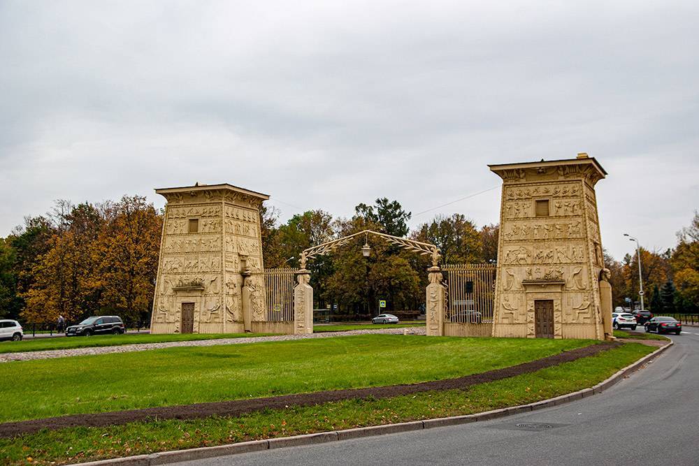 На въезде в Пушкин со стороны Петербурга стоят чугунные Египетские ворота, стилизованные под древнеегипетскую архитектуру. Символы на фасадах не несут никакого смысла, они просто скопированы с египетской Книги мертвых