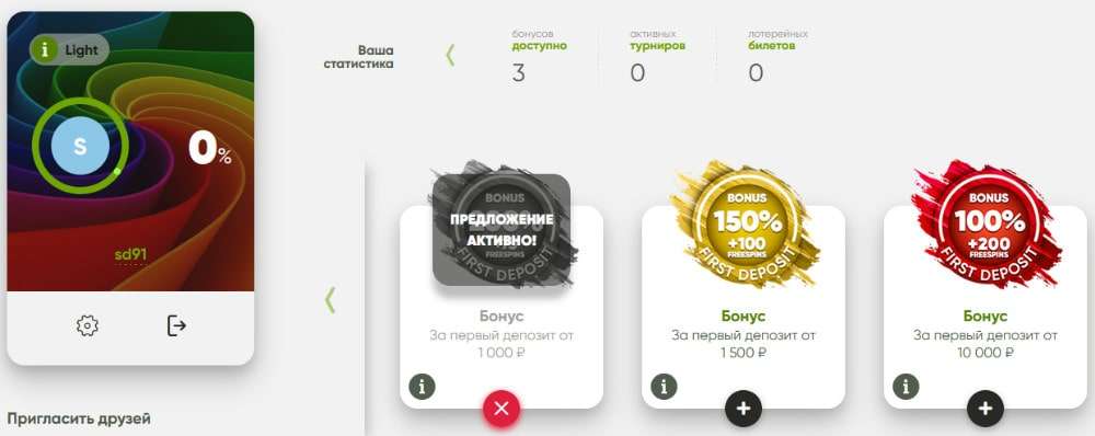 Также одним из преимуществ выделяют получение бонусов при регистрации на официальном сайте. Конечно же, чем больше первый минимальный депозит — тем солиднее подарок. Максимальное количество бонусных денег, которые можно забрать при выводе составляет 10000 рублей. Помимо поощрения описаного выше, после поступления средств на баланс в течение пары минут дополнительно появится возможность использовать 200 бесплатных вращений (free spins).