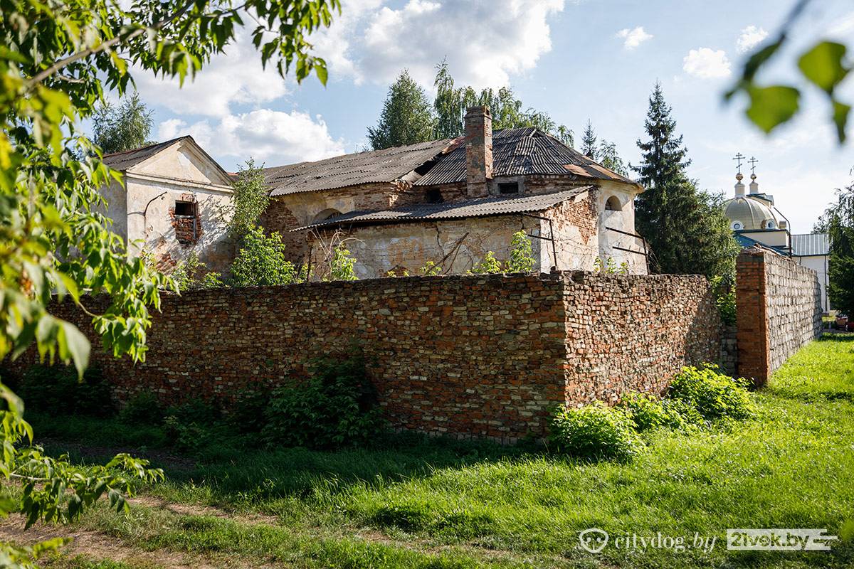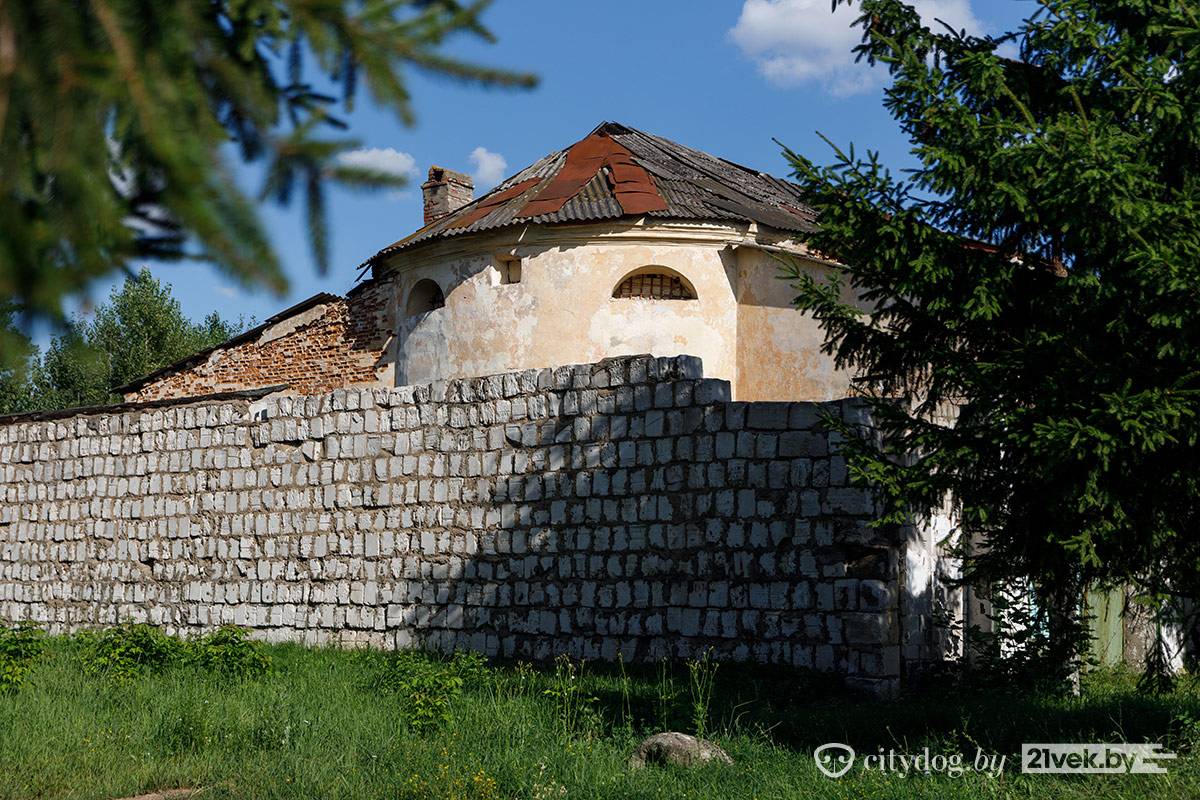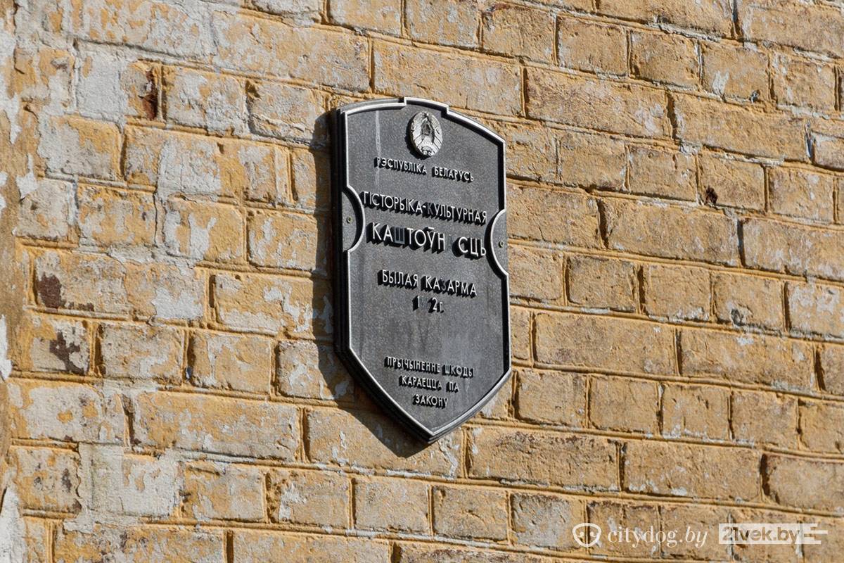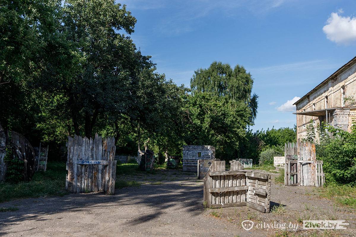 Рядом с костелом находится кирпичное здание бывших казарм. На стене – гордая табличка «Гісторыка-культурная каштоўнасць. Прычыненне шкоды караецца па законе». Во дворе историко-культурной ценности – деревянные поддоны, доски и шины со следами краски. Здесь играют в пейнтбол.