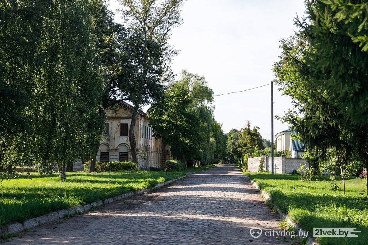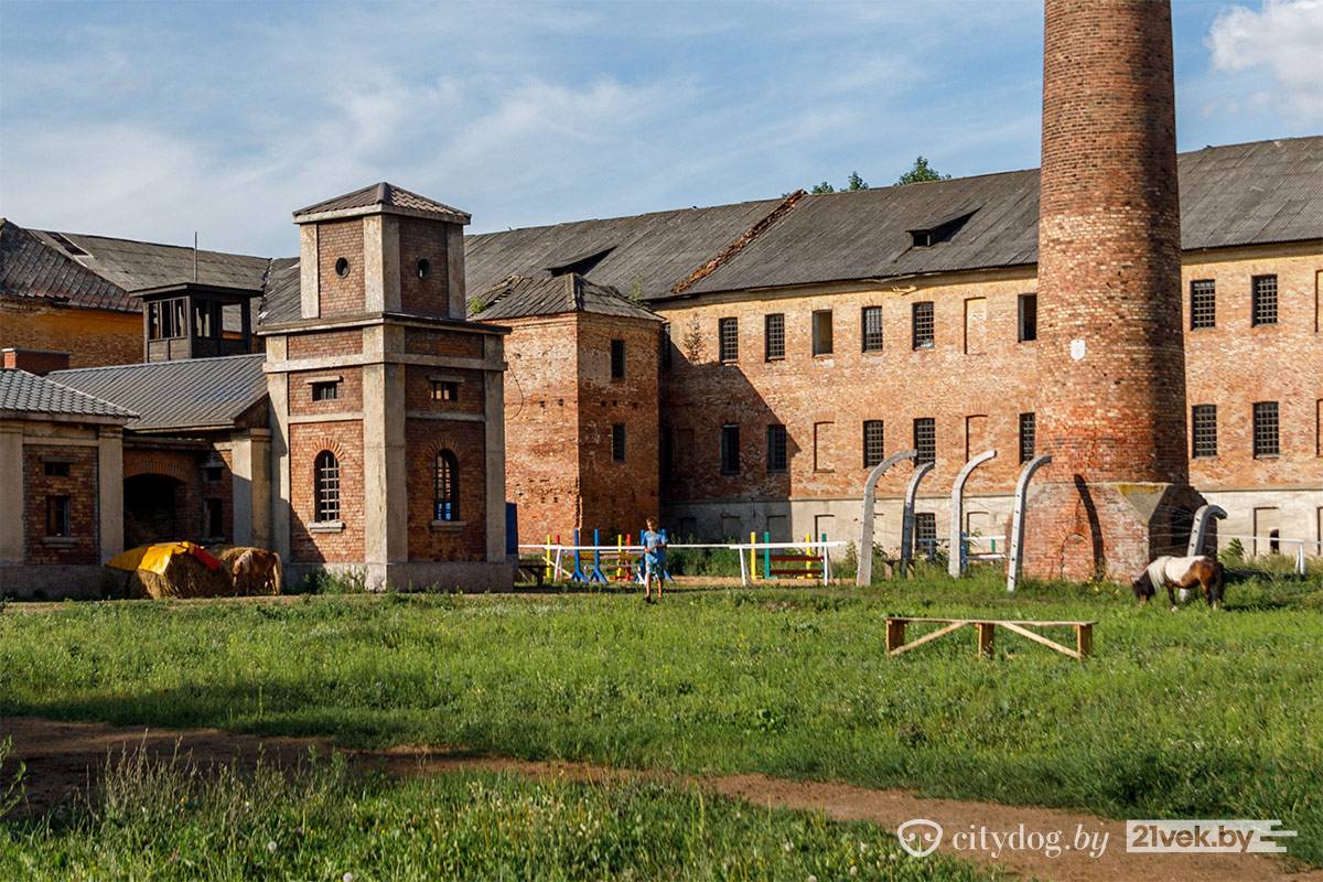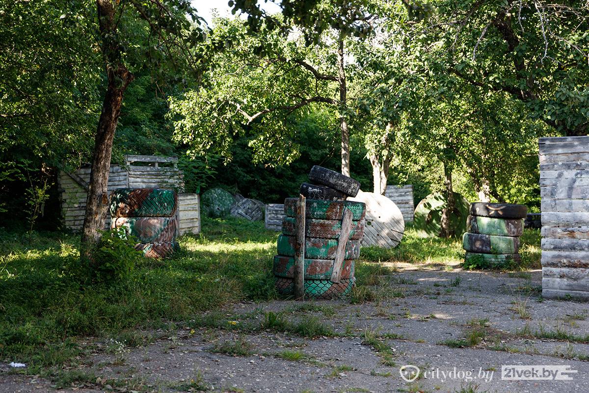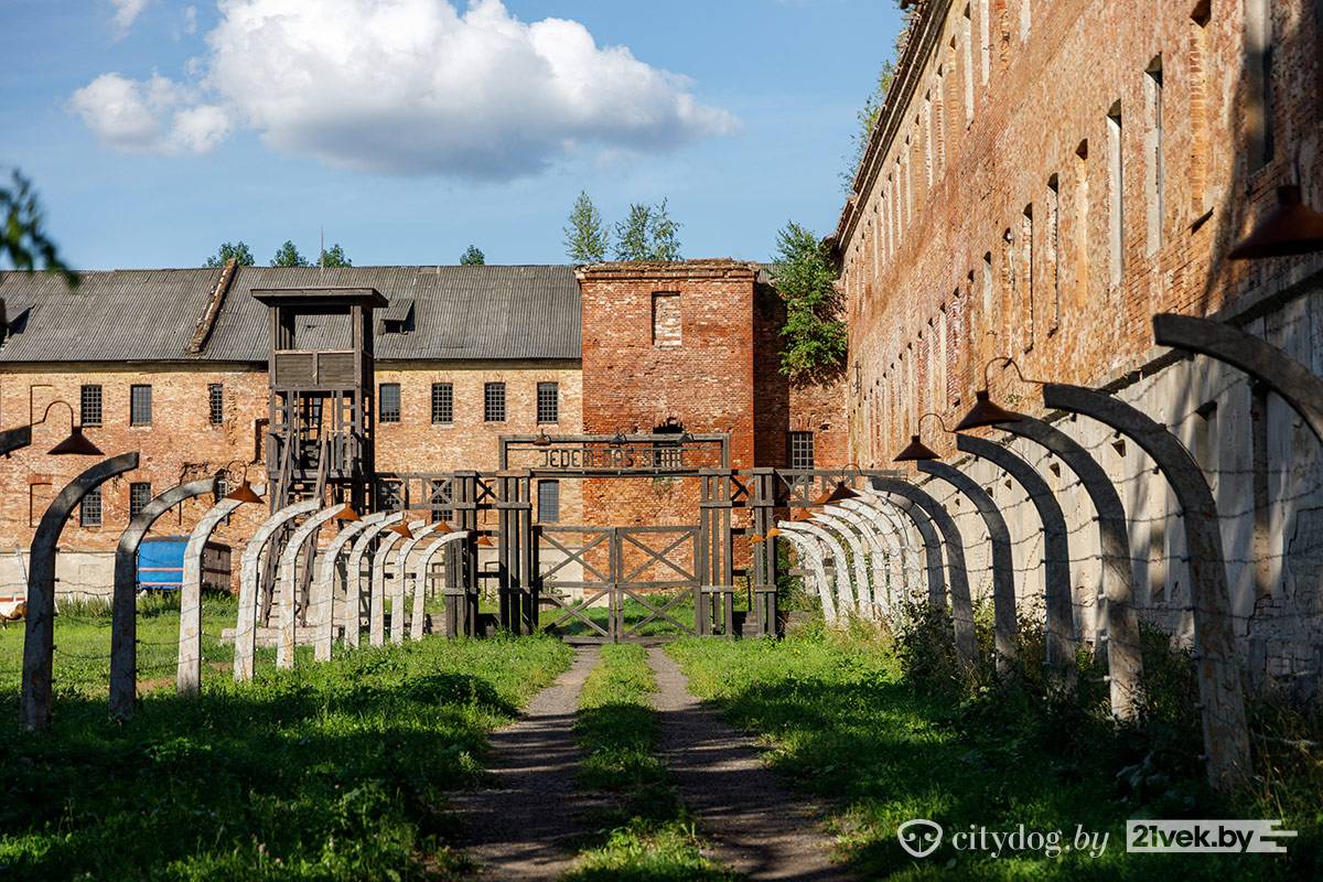 Рядом с костелом находится кирпичное здание бывших казарм. На стене – гордая табличка «Гісторыка-культурная каштоўнасць. Прычыненне шкоды караецца па законе». Во дворе историко-культурной ценности – деревянные поддоны, доски и шины со следами краски. Здесь играют в пейнтбол.