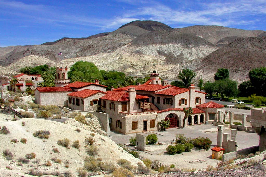 - Замок Скотти (Scotty’s Castle) Очень разнообразный район. Во-первых, здесь можно увидеть оазис посреди пустыни – знаменитый замок знаменитого Скотти, который некогда просто влюбился в эти места. Во-вторых, эта часть парка знаменита кратером вулкана, песчаными дюнами и, что самое главное, ползающими камнями (The Racetrack).