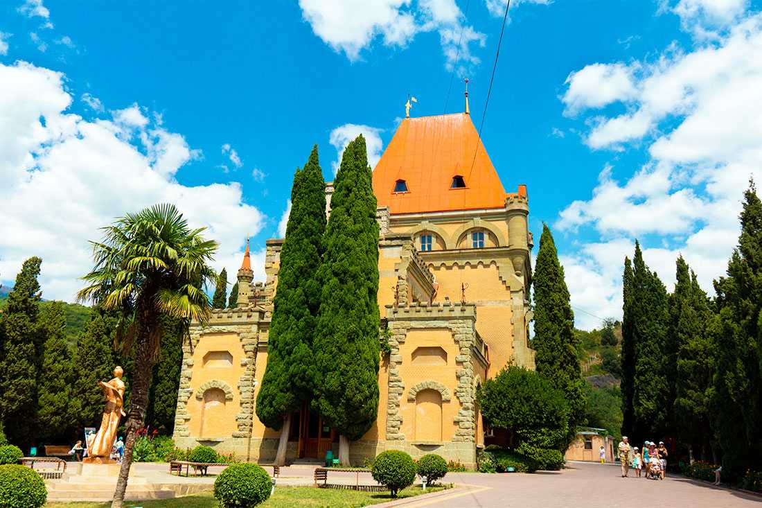 Этот дворец в романском стиле был построен в 1905 – 1907 годах. Автором проекта выступил создатель Ливадийского дворца в Ялте, знаменитый архитектор Н.П. Краснов. Здание было возведено по заказу княгини Анастасии Давидовны Гагариной. Для оформления интерьеров керамическая плитка и мраморные лестницы были привезены из Италии, венецианское стекло доставлено из Франции, а черепица для кровли – из Германии. Над главным входом размещен родовой герб князей Гагариных.