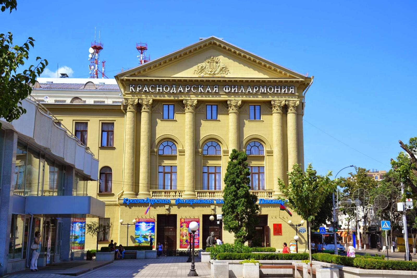 Краевая филармония им. Г.Ф. Пономаренко. Здание построено в 1909 году и является памятником архитектуры Краснодара. Сначала в этом доме с колоннами работал городской драмтеатр, а филармонии его передали в