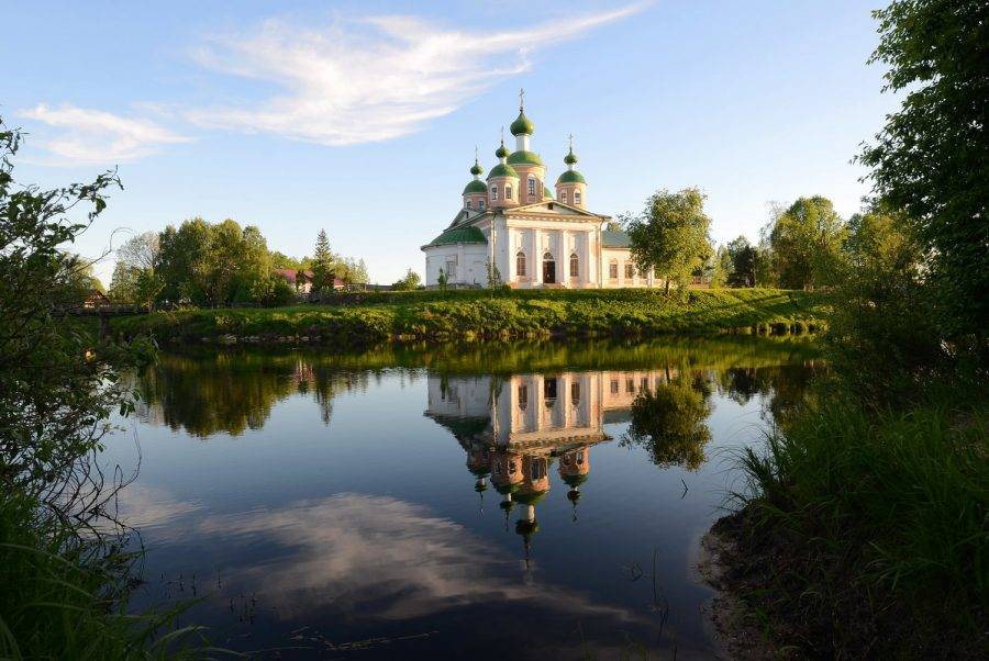 Собор, освящённый в честь Смоленской иконы Божьей Матери, был возведён в первой половине XIX века. Пятиглавый храм в стиле классицизма расположился в живописном месте — на зелёном острове Мариам, побережье которого охватывают сразу две реки: Олонка и Мегрега. Здесь они сливаются, образуя единый поток.