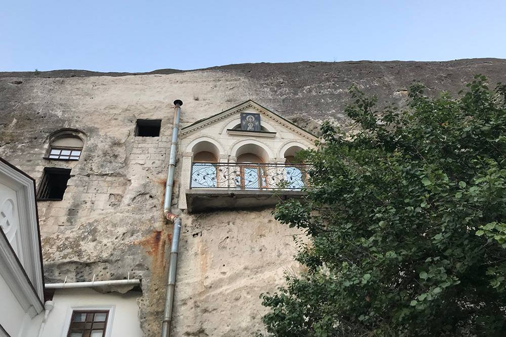 У подножия Монастырской скалы, на плато которой находятся развалины крепости, расположен Инкерманский пещерный монастырь. Его жилые помещения высечены в обрыве скалы в три яруса. Внутрискальные помещения соединялись каменными лестницами. С завоеванием Крыма турками монастырский комплекс пришёл в упадок. Его воссоздание началось только после присоединения полуострова к Российской империи.