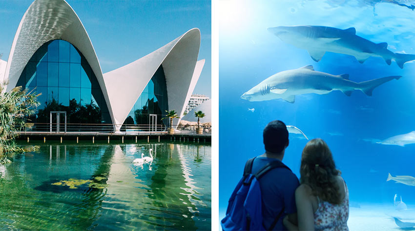 Океанографик. Этот удивительный объект – тоже музей, но очень необычный. Океанографический парк Валенсии считается самым большим в Европе. Одна часть — под землей, другая – под открытым небом. Здесь можно не только посмотреть на экзотических рыбок, но и совершить прогулку среди бабочек и райских птиц.