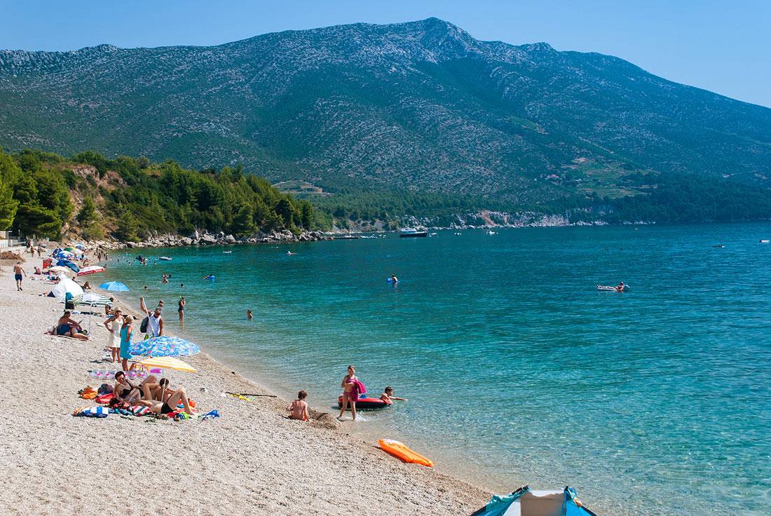 Все побережье покрыто галькой с удобным спуском в море, почти везде мелководно. Недостатком в отзывах многие отмечают отсутствие пунктов питания. Но они есть в самой деревне, придется отправиться перекусить туда. Зато удастся окунуться в местную атмосферу и познакомиться с хорватами.