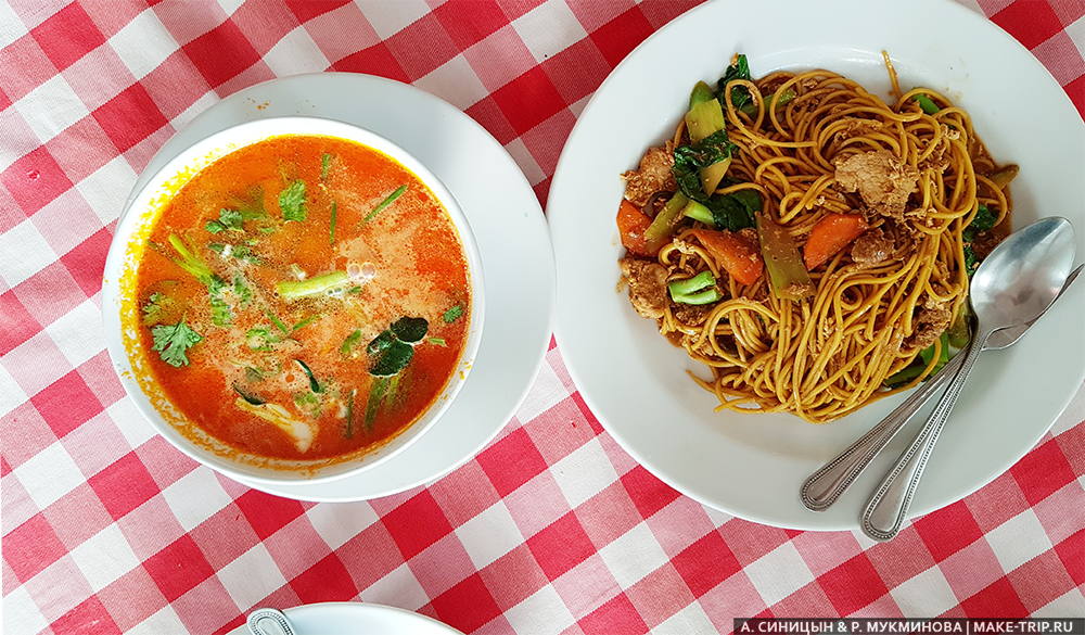Тайский обед из двух блюд: Том Ям и лапша с курицей.