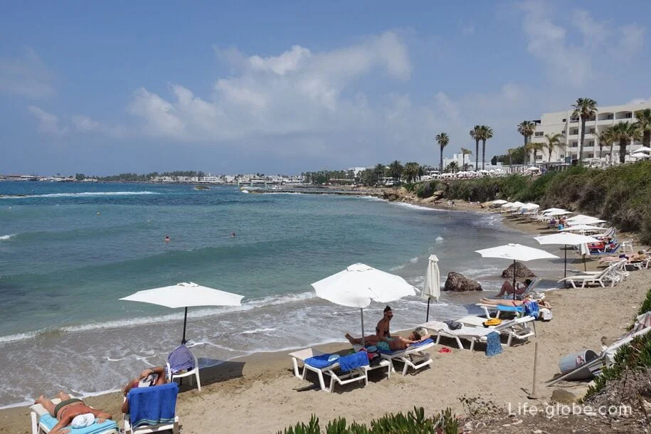 Не все пляжи здесь пригодны для семейного отдыха с детьми. Во-первых, некоторые из них галечные, во-вторых, в воде часто попадаются камни. Определить где безопасно входить в воду можно по скоплению людей, где их больше, там более безопасно. Вся береговая линия является городской и не принадлежит не одному отелю. Отдыхать можно здесь бесплатно, платить нужно только за зонтики, лежаки и другие услуги. К популярным, а значит и хорошо оборудованным пляжам в Напе можно отнести: