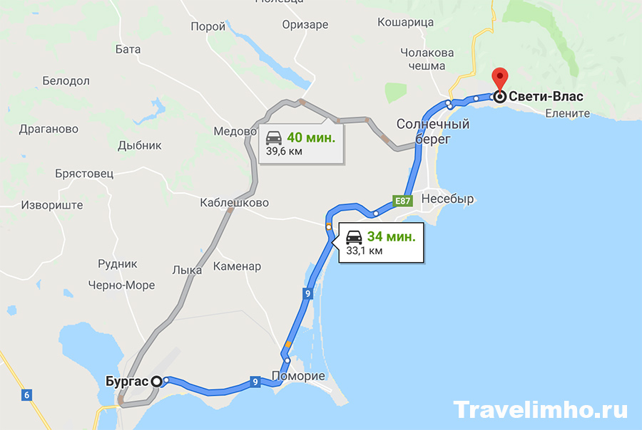 - Оптимальный маршрут из Москвы – самолет до Бургаса. Авиабилеты стоят от 3920 руб. Время перелета – 2 ч. 20 мин. Прямого автобуса из Бургаса до Свети-Власа нет. Придется сначала ехать в Солнечный Берег, а затем в Свети-Влас. За билеты на автобусы придется заплатить около 230 руб. Путь с пересадкой займет от 40 мин. до 1 часа. Можно взять такси за 2500 руб.