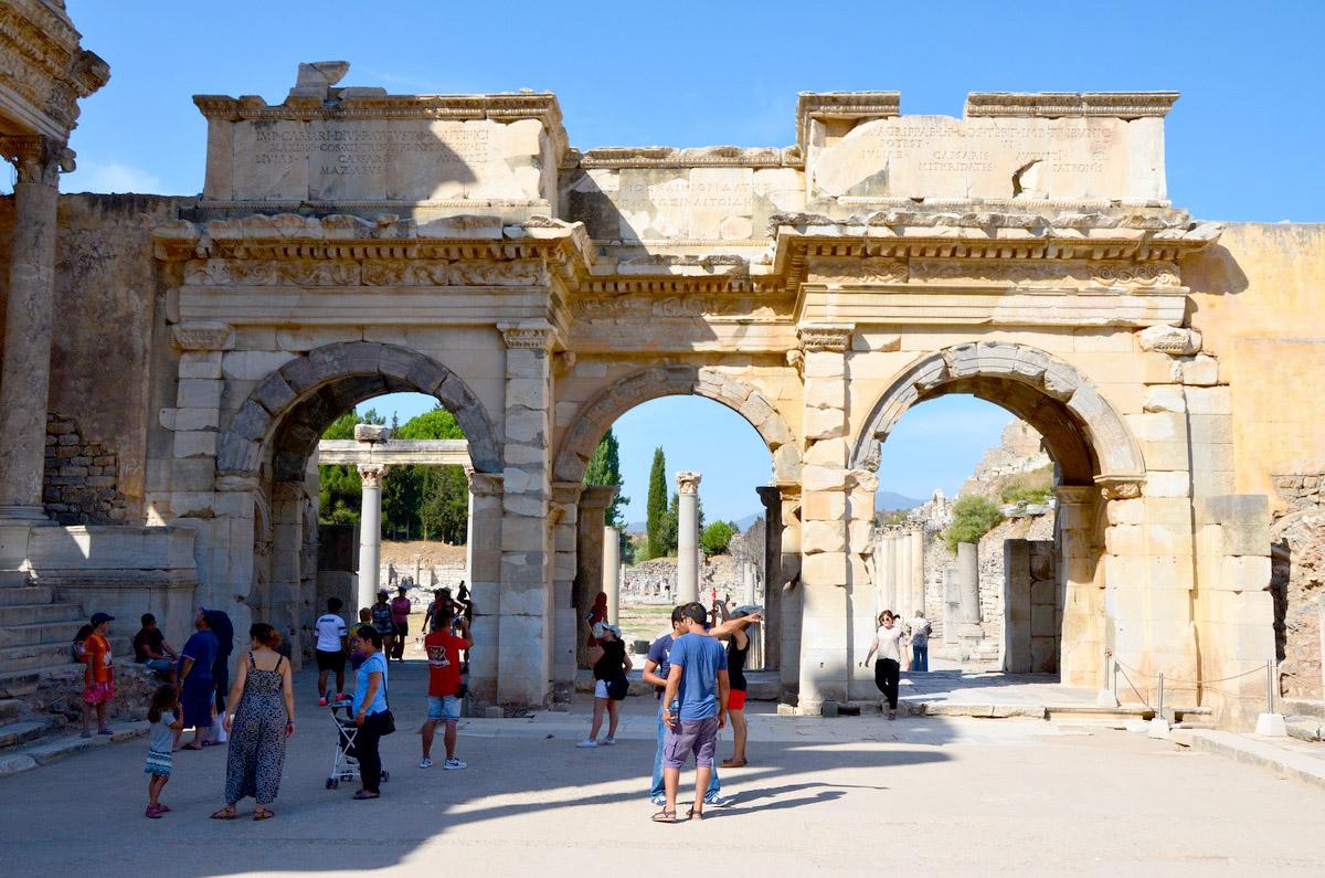 Театр Эфеса, вмещавший 25000 зрителейРеконструированный фасад библиотеки Цельса в Эфесе, построенной в 135 годуХрам императора Адриана с бюстом богини Тихе на арке снаружи и Медузой внутри, сооружен в 138 годуРеконструированный общественный туалет Эфеса
