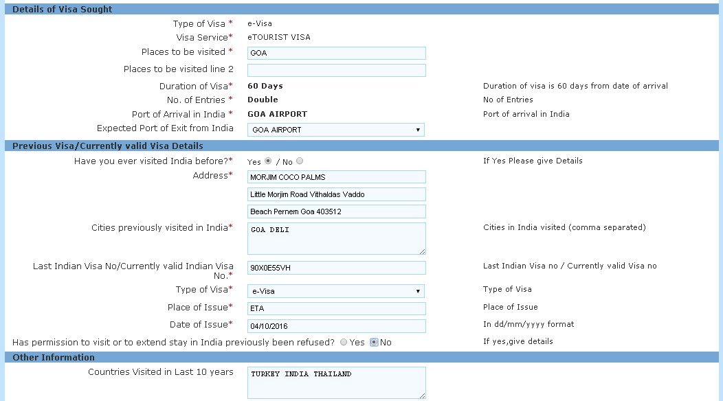 Анкета на визу заполняется онлайн по адресу: indianvisaonline.gov.in. Вносимая информация должна быть на английском языке. Заполнять необходимо все поля, отмеченные красной звездочкой. Если она отсутствует, информацию можно вносить по желанию.