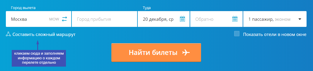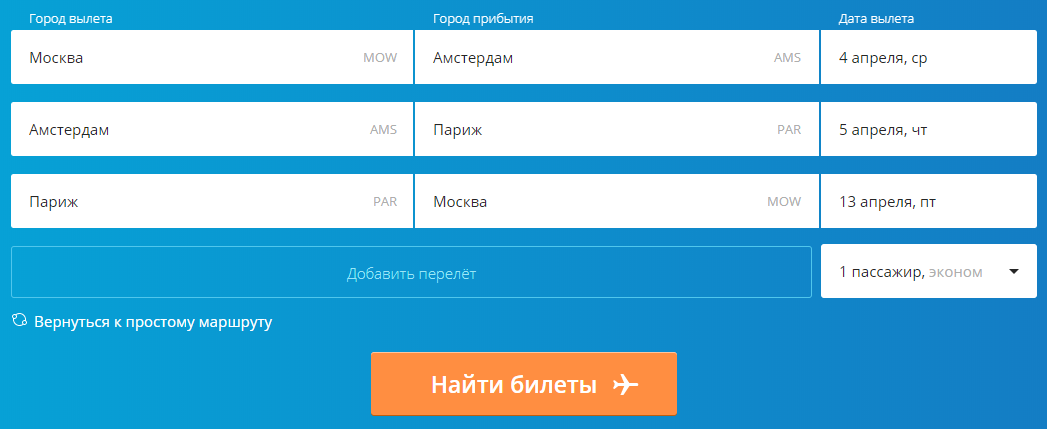 Если в ваши планы входит добраться из пункта A в пункт Б любыми способами, то описанный выше вариант подойдет. А если у вас особенные пожелания по городам и датам, то на главной странице можно составить сложный маршрут: