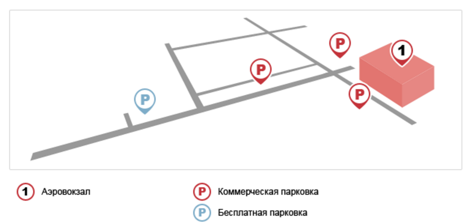 Расположение парковок можно также посмотреть на схеме зоны, прилегающей к аэровокзалу. В самой зоне находятся несколько видов парковок.