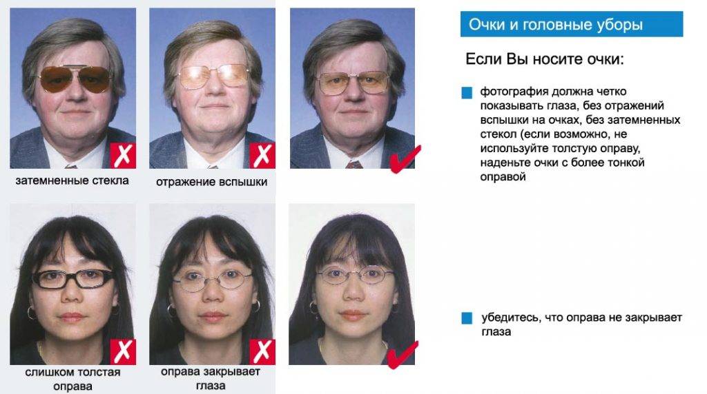 - Очки должны иметь прозрачные стекла, от которых не создается бликов. Не допускается массивная оправа, закрывающая большую часть лица. В таком случае лучше фотографироваться без очков.