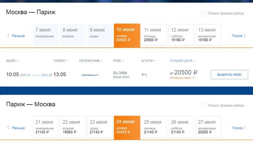 Прямые рейсы есть, но они дорогие и ограниченные. Tutu.ru предлагает прямой рейс Москва-Париж за 58 000 рублей, а на странице Аэрофлота цены начинаются с 21 000 рублей. Перелет длится примерно 4 часа.