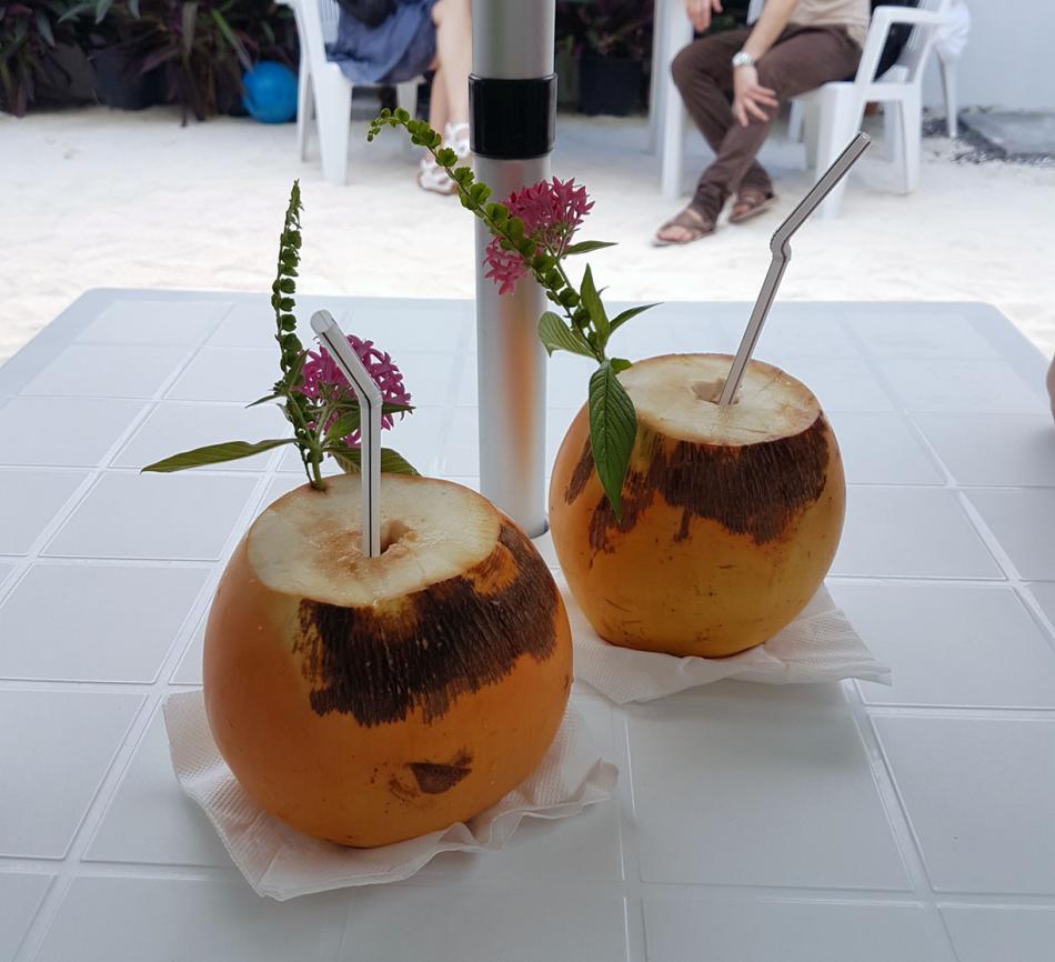На причале нас встретил сотрудник гостиницы. Он предложил на выбор: доехать до отеля на микроавтобусе или пройтись. Мы выбрали второе, так как засиделись в лодке. Прогулка до здания заняла примерно 10 минут. Пока длилось оформление нашего и еще 2-х других номеров, нам принесли welcome drink — 2 кокоса с прохладным молоком, которое, кстати, отлично утоляет жажду. После оплаты номеров, нам выдали ключи, рассказали местные правила и провели экскурсию по гесту.