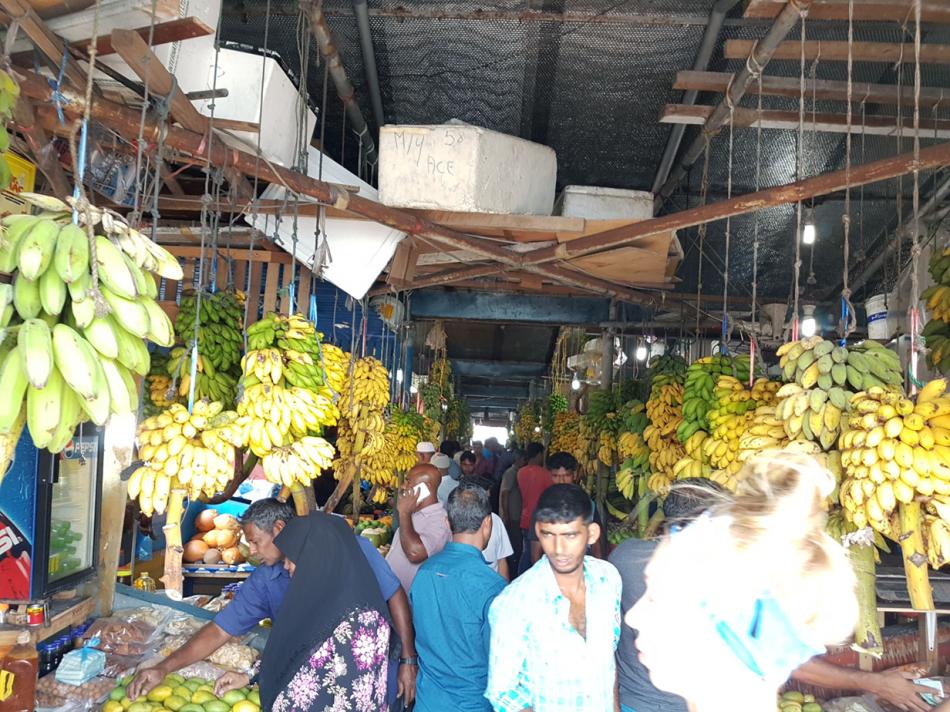 Сперва заглянули на фруктовый. Судя по количеству людей, он пользуется большой популярностью. По соседству с экзотизмами на тесных прилавках лежат и висят связки бананов всех сортов. Обывателю из северных широт трудно вообразить такое видовое разнообразие. Впечатлила система хранения. Вдоль крыши построено что-то типа лесов или балок, на которых стоят коробки. Жаль не удалось посмотреть, как их снимают и ставят. Наверное, мальдивцы демонстрируют чудеса акробатики, а артисты цирка Дю Солей им завидуют.